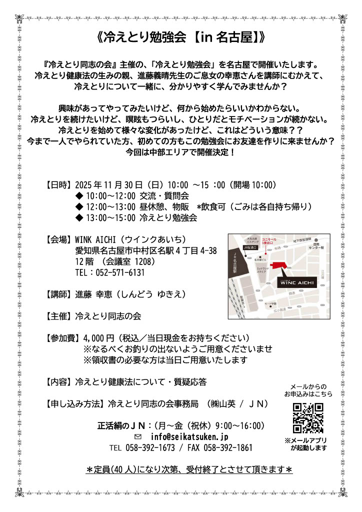 11月30日(日)名古屋開催 冷えとり勉強会のお知らせ【講師:進藤幸恵】